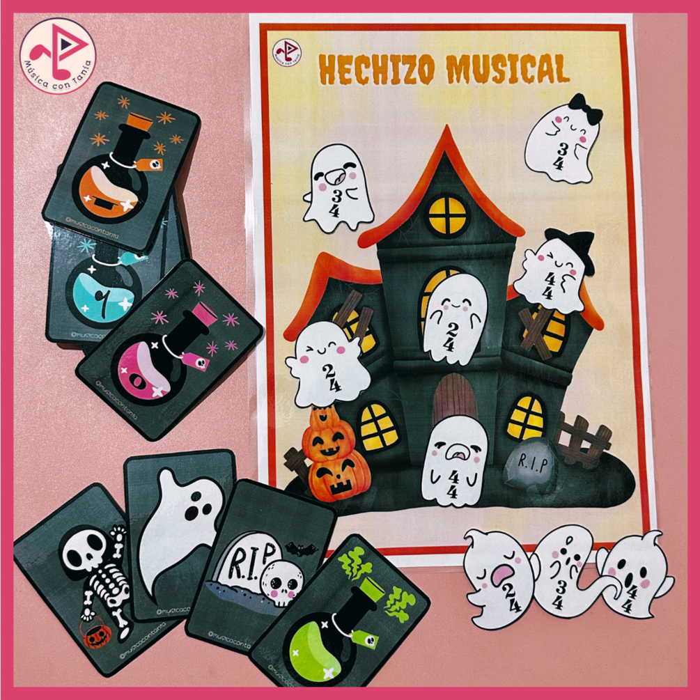 ¡Echad a los fantasmas de la mansión! Para ello tendrán que conseguir pócimas con figuras que sumen los tiempos de compases de 2/4, 3/4 y 4/4. Pero mucho cuidado con las cartas especiales...
